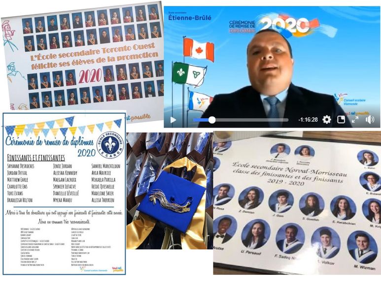Toronto, le 6 juillet 2020 – La cohorte des 537 finissantes et finissants 2020 a célébré sa graduation de façon virtuelle cette année. Les cérémonies ont eu lieu les 24 et 25 juin derniers sur la plateforme Teams. Vêtu de leur toque et mortier, chaque élève a eu droit à une remise de diplôme mémorable, et ce dans le confort de sa maison, accompagné de près ou de loin par sa famille, ses amis et le personnel du Conseil scolaire Viamonde. Grâce aux efforts continus des membres du personnel des écoles secondaires, plus de 2 000 familles se sont connectées, parfois même de l’extérieur du Canada, pour assister à ce moment si important dans la vie de ces jeunes adultes.