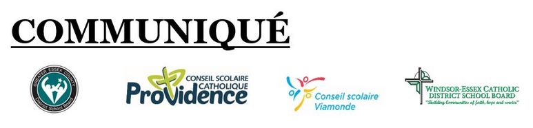 Windsor, 11 mars 2021 - C’est dans l’optique d’une approche communautaire que les quatre conseils scolaires de Windsor-comté d’Essex unissent leurs efforts dans le but de faciliter l’accès aux tests de dépistage ciblé aux enfants d’âge préscolaire, aux élèves ainsi qu’aux membres du personnel des écoles désignées. Ces tests sont disponibles sur une base volontaire aux personnes qui ne présentent pas de symptôme (asymptomatique), mais souhaiteraient faire un test de la COVID-19.
