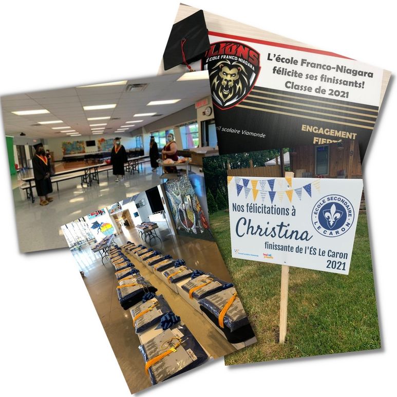 Afin de célébrer la graduation des finissantes et finissants de cette année, certaines écoles ont saisi l’occasion pour rendre cet événement mémorable, et ce malgré la pandémie. Par exemple, le Collège français, l’École secondaire Le Caron et l’École secondaire Franco-Niagara ont préparé des affiches à mettre sur les parterres des maisons de leurs élèves. D’autres écoles telles que l’École secondaire Toronto Ouest ont partagé sur les réseaux sociaux la distribution de toges et mortiers. Et puis, les finissantes et finissants de l’École secondaire Georges-P.-Vanier ont reçu un beau message deuopen_in_newCe lien s'ouvrira dans une nouvelle fenêtre Michelle Dubé, journaliste à CTV News!