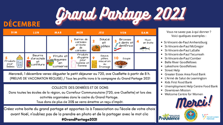 Du 1er au 10 décembre, le Centre communautaire francophone de Windsor-Essex-Kentopen_in_newCe lien s'ouvrira dans une nouvelle fenêtre (CCFWEK) et ses partenaires recueilleront les dons lors d’activités et de campagnes de collecte dans les écoles et les institutions de la région. Ces dons seront remis aux associations d’aide locales. Chacune des 11 journées de la campagne met en vedette une denrée alimentaire à apporter aux divers points de cueillette. Les membres de la communauté ont également la possibilité de créer des boîtes de denrées et à les prendre en photo pour les partager sur les réseaux sociaux avec le mot clic #GrandPartage2021.
