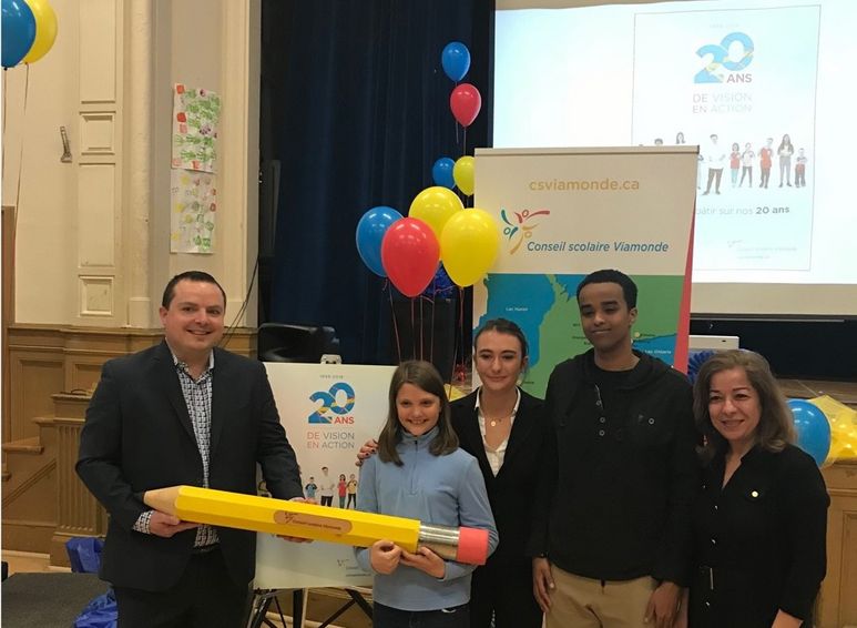 Toronto, le 4 avril 2018 – Le Conseil scolaire Viamonde a dévoilé aujourd’hui la programmation des festivités entourant son 20e anniversaire. En direct de l’École élémentaire Gabrielle-Roy de Toronto, l’événement était aussi diffusé sur la page Facebook de Viamonde pour permettre à toutes les écoles et à la communauté d’être de la partie. Plusieurs activités sont prévues au cours des deux prochains mois pour souligner cet anniversaire important. Le jeu questionnaire Connais-tu ton Viamonde?, la Viacourse et une grande fête dansante de clôture seront les éléments phare de ces festivités.