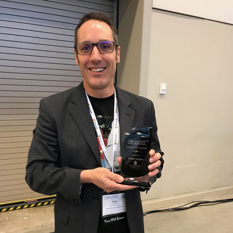 Toronto, 2 mai 2019 – M. Serge Gingras, superviseur des techniciens en informatique en appui aux services pédagogiques reçoit le prix de Technicien innovateur à la conférence Connect 2019. Il voit ainsi être récompensées ses compétences, ses actions et ses bonnes pratiques qui ont amélioré l'expérience des élèves et des membres du personnel.