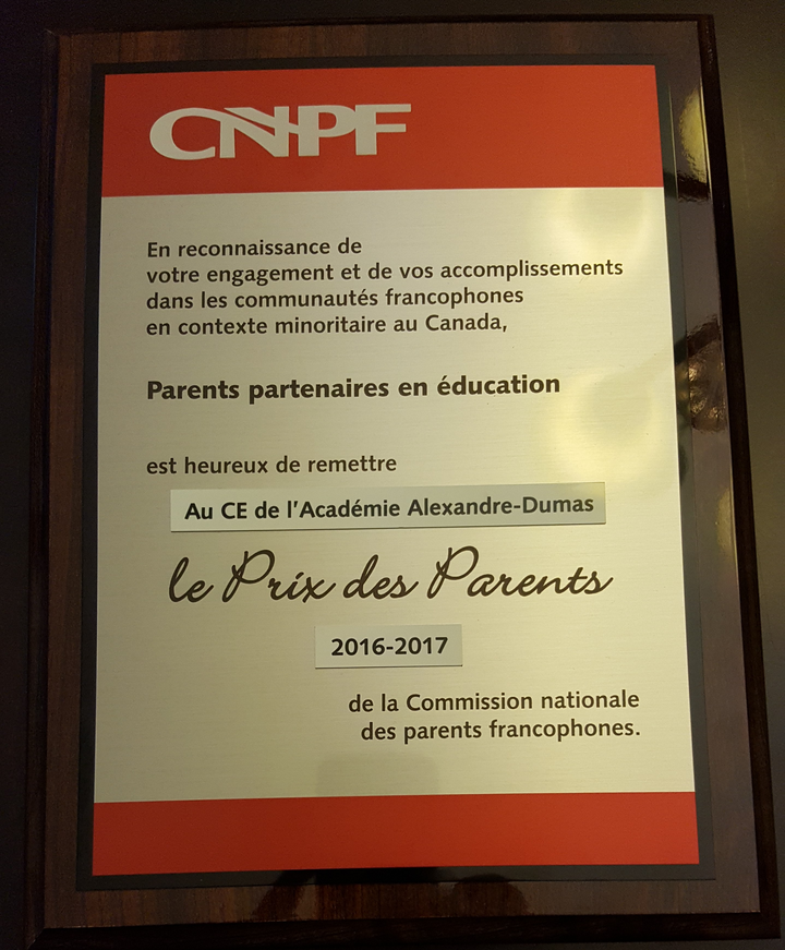 Toronto, le 6 juin 2017 – Les membres du conseil d’école de l’Académie Alexandre-Dumas de Toronto sont les heureux récipiendaires du prix du Partenariat de la Commission nationale des parents francophones (CNPF) région de l’Ontario et de Parents Partenaires en Éducation (PPE). Ce prix vise à souligner la mise en œuvre d’un projet impliquant la…