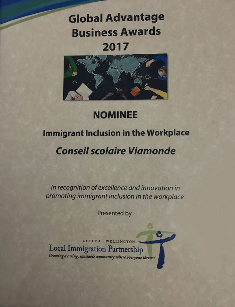 Toronto, le 5 avril 2017 – Le Conseil scolaire Viamonde a été honoré en tant que finaliste dans la catégorie « Inclusion des immigrants sur les lieux de travail » lors du Global Advantage Business Award 2017. Ce mérite nous a été décerné par le « Partenariat local pour l’immigration » de la région de Guelph-Wellington pour l’excellence et l’innovation du Conseil dans la promotion et l’inclusion des nouveaux arrivants.