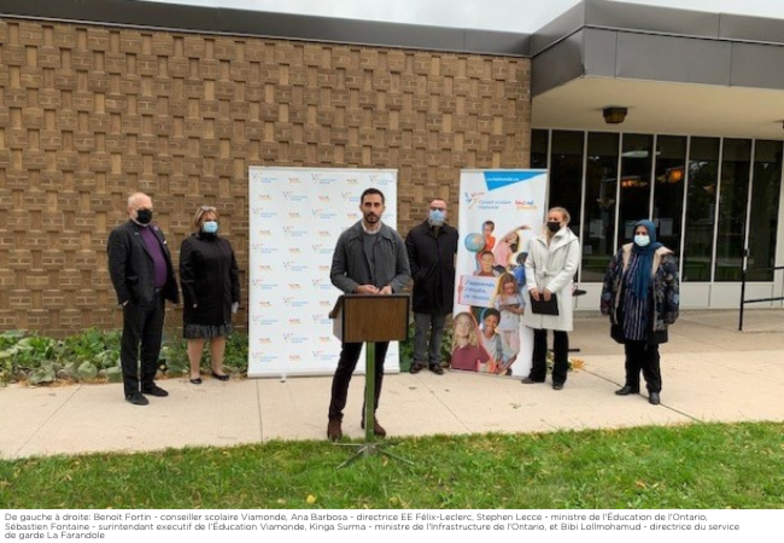 29 octobre : Le gouvernement ontarien appuie le Conseil scolaire Viamonde dans son projet d’agrandissement du service de garde d’enfants à l’École élémentaire Félix-Leclerc, située à Etobicoke. Les nouveaux locaux du service de garde, représentent un investissement financier de 2 475 000 $ et permettront d’accueillir 49 enfants de plus, répartis dans trois nouvelles salles, incluant un tout nouveau programme pour les poupons.